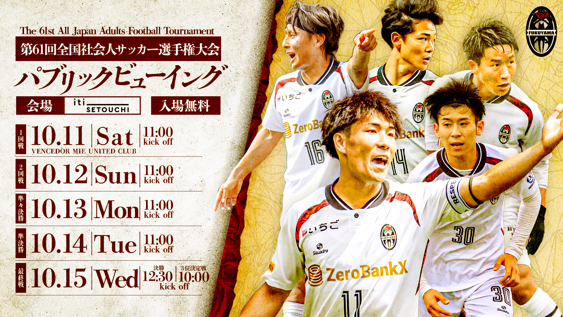 この度、第61回全国社会人サッカー選手権大会のパブリックビューイングを「iti SETOUCHI」会場にて、開催していただくこととなりましたので、お知らせいたします。