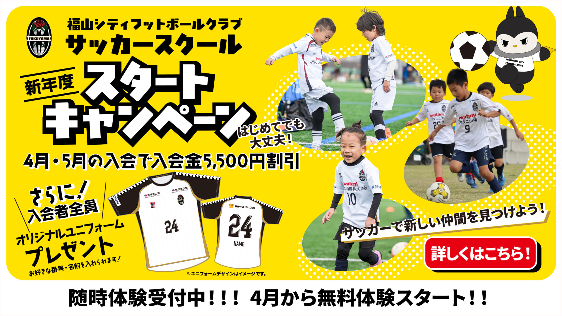 この度、福山シティFCサッカースクールでは《春の入会キャンペーン》を実施いたします。