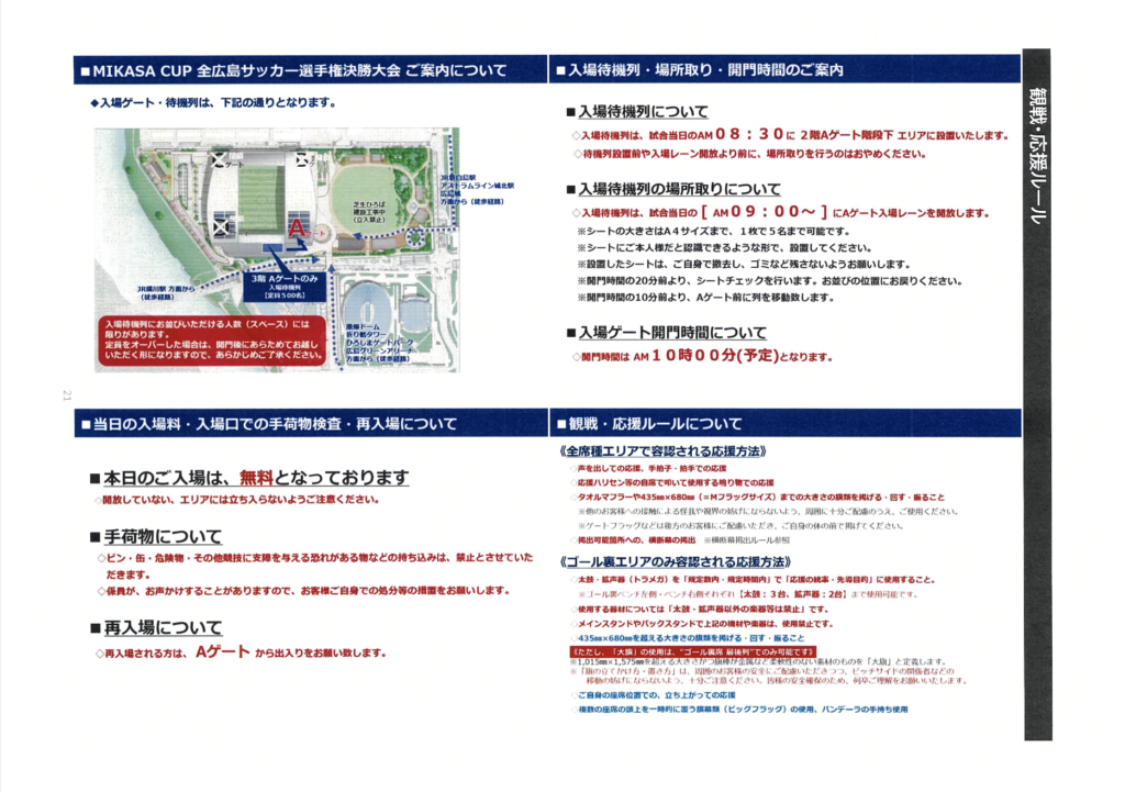 4月19日(日)に行なわれます、「MIKASA CUP 全広島サッカー選手権大会 決勝大会兼天皇杯JFA第106回全日本サッカー選手権大会県代表決定戦」決勝の試合は、以下の試合観戦ルールのとおり行われます。