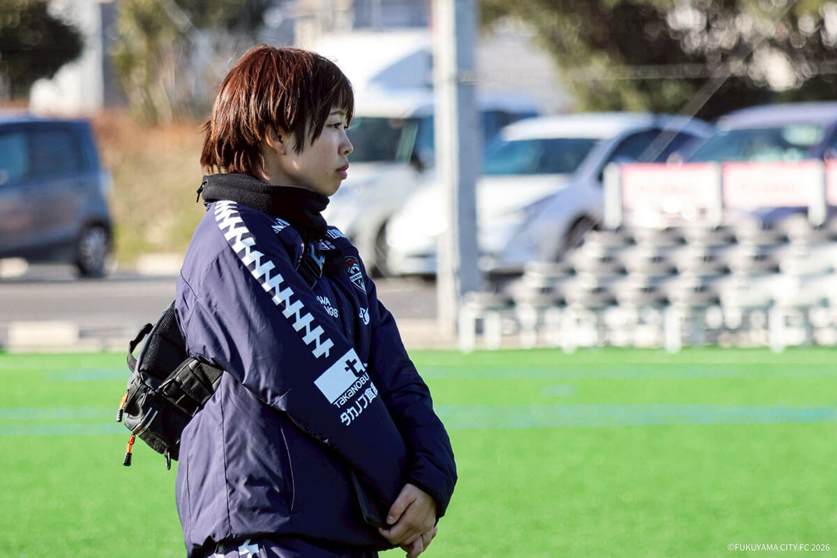 専門学校の先輩がきっかけで、INAC神戸レオネッサでトップチームトレーナーとして勤務。プロスポーツ現場のトレーナーとしての行動や必要なこと、様々なことを教えてもらった。その後、マイナビ仙台レディースのアカデミーでフィジカルコーチとして勤務。もっと成長したいと思い、2026シーズンから福山シティFCへ。